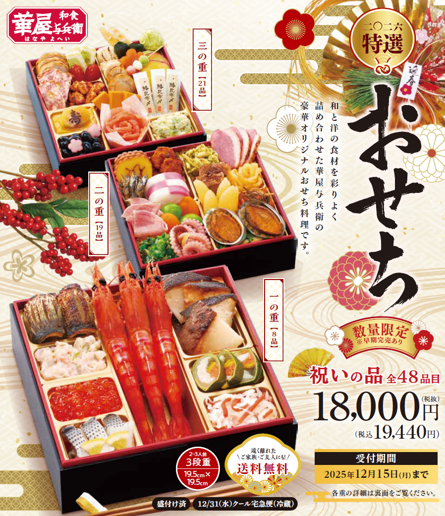2026年 華屋与兵衛の特選おせち 販売価格 19,440円(税込み) 会員価格 (税込み) 通常価格 (税込み) 在庫 商品コード HY202601 JANコード 数量 1 カートに入れる 入荷通知メールを希望する 注文数制限 1 ~ 1 販売期間 2025/10/10 09:00~2025/12/15 23:00 ツイートする シェアする
